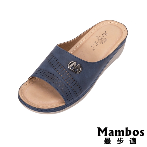 [快速出貨] 簡約車線縷空舒適厚底坡跟拖鞋 藍*Mambos 曼步適* |