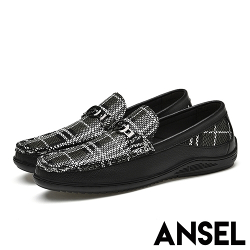 [快速出貨] 真皮頭層牛皮格紋撞色網紋馬銜釦樂福鞋 黑*ANSEL* |