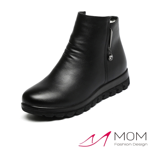 真皮保暖機能時尚金屬寶石釦飾厚底短靴 黑*MOM* |