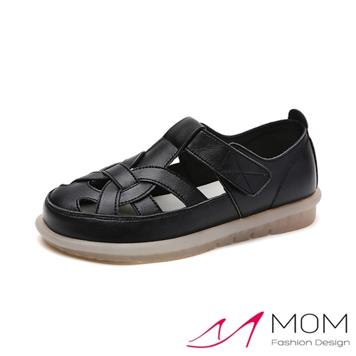 真皮幾何縷空線條小圓頭魔鬼粘平底涼鞋 黑*MOM* |