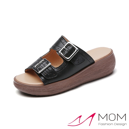 真皮布洛克雕花皮帶釦造型厚底拖鞋 黑*MOM* |