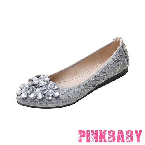 小尖頭金屬亮絲抓皺布孔雀水鑽造型軟底平底鞋 灰*PINKBABY* |