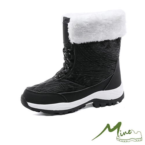 保暖機能毛絨翻領綁帶造型登山短靴 雪靴 黑*MINE* |