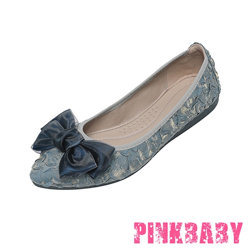 小尖頭金絲抓皺綢緞蝴蝶結軟底平底鞋 蛋捲鞋 藍*PINKBABY* |