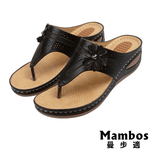復古皮雕立體花朵夾腳坡跟厚底拖鞋 黑*曼步適* |