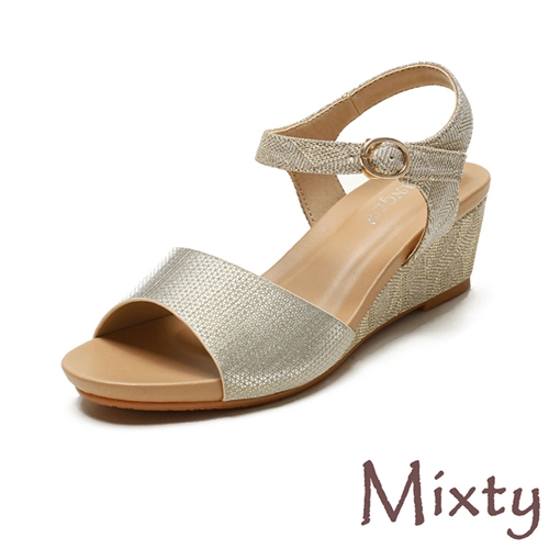 歐美復古金屬亮皮拼接魚口露趾坡跟涼鞋 金*MIXTY* |