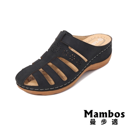 魚骨縷空線條復古舒適坡跟厚底包頭拖鞋 黑*曼步適* |