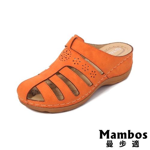 魚骨縷空線條復古舒適坡跟厚底包頭拖鞋 橘*曼步適* |