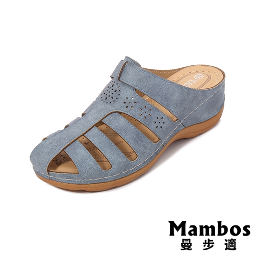 魚骨縷空線條復古舒適坡跟厚底包頭拖鞋 灰*曼步適* |