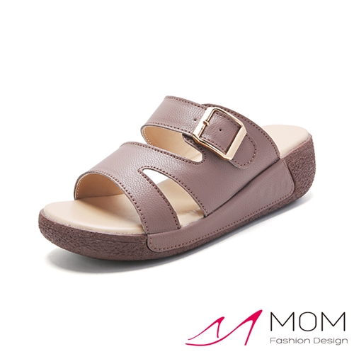 真皮百搭Z字皮帶釦造型厚底拖鞋 豆沙*MOM* |