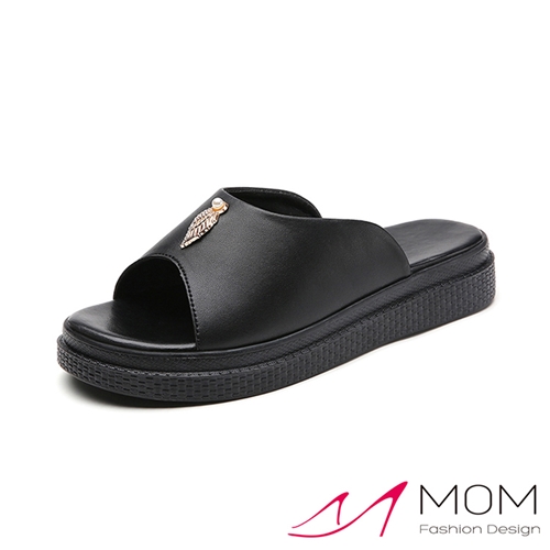 真皮魚口露趾優雅珍珠飾件厚底拖鞋 黑*MOM* |
