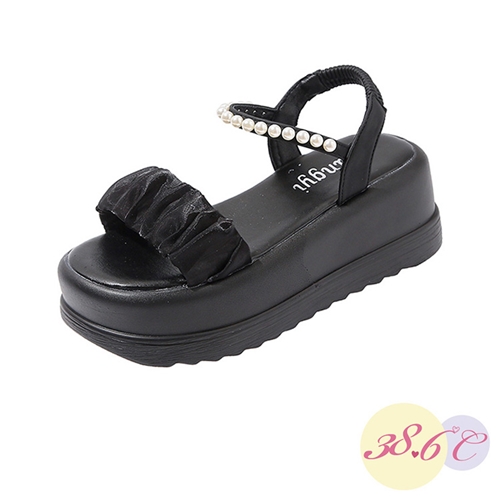 甜美抓褶珍珠一字帶厚底涼鞋 黑*38.6度C* |
