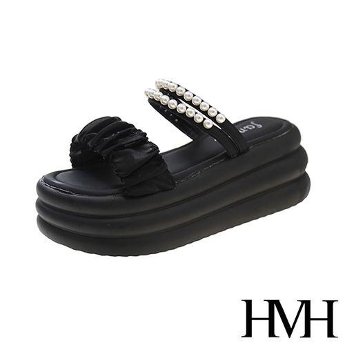 網紗緞面抓褶一字珍珠鍊帶厚底涼拖鞋 黑*HMH* |