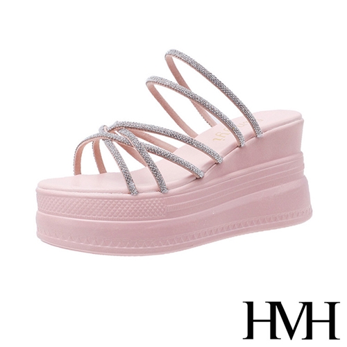 閃耀亮絲細帶交叉造型坡跟厚底拖鞋 粉*HMH* |
