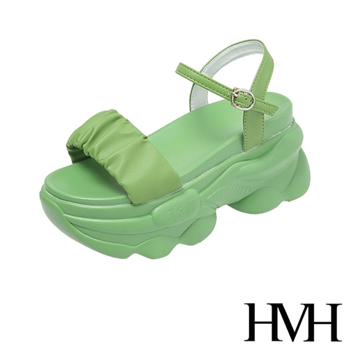 復古個性抓褶一字帶造型厚底涼鞋 綠*HMH* |