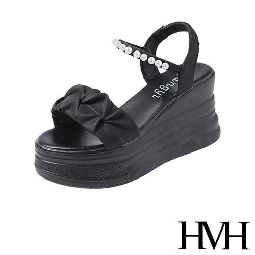 甜美褶皺一字帶珍珠綴飾造型厚底涼鞋 黑*HMH* |