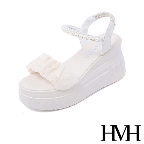 唯美網紗珍珠一字帶坡跟厚底涼鞋 米*HMH* |