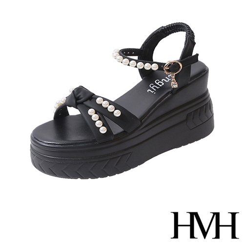 甜美珍珠蝴蝶結造型坡跟厚底涼鞋 黑*HMH* |