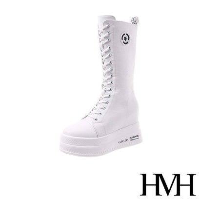 素色布面內增高厚底繫帶中筒靴 白*HMH* |