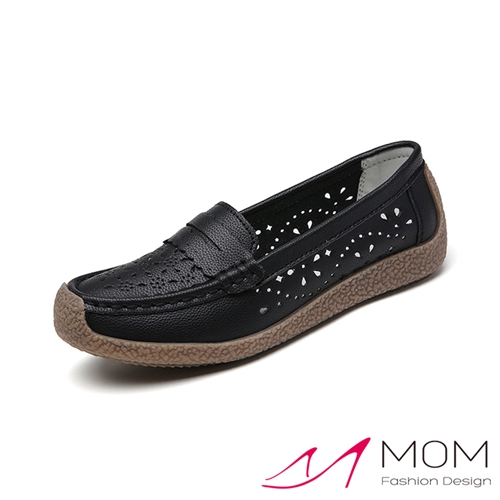 真皮縷空刻花舒適休閒軟底蝸牛鞋 樂福鞋 黑*MOM* |