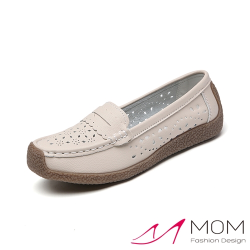 真皮縷空刻花舒適休閒軟底蝸牛鞋 樂福鞋 米*MOM* |