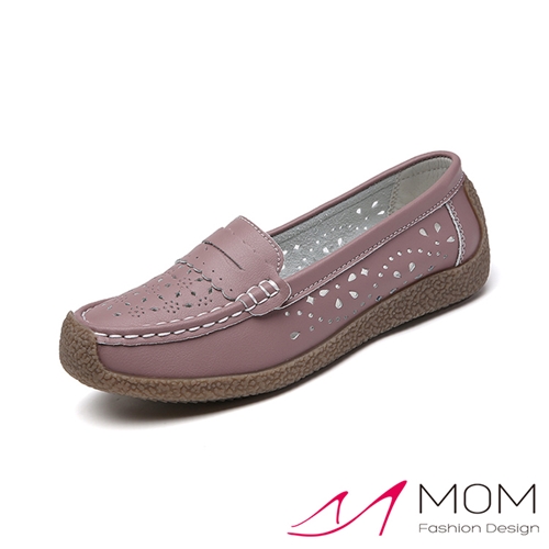 真皮縷空刻花舒適休閒軟底蝸牛鞋 樂福鞋 豆沙*MOM* |