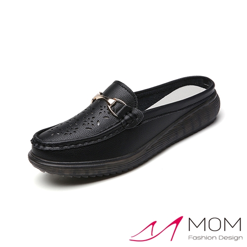 真皮縷空刻花馬銜扣飾包頭坡跟拖鞋 黑*MOM* |