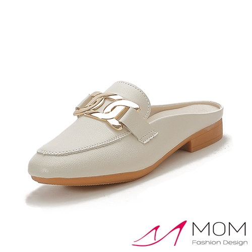 真皮時尚金屬釦造型包頭低跟拖鞋 米*MOM* |