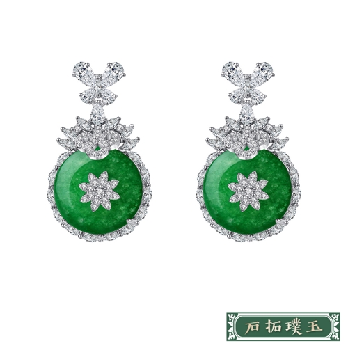閃耀美鑽鑲嵌蝴蝶造型綠玉隨蓮花造型耳環*石拓璞玉* |