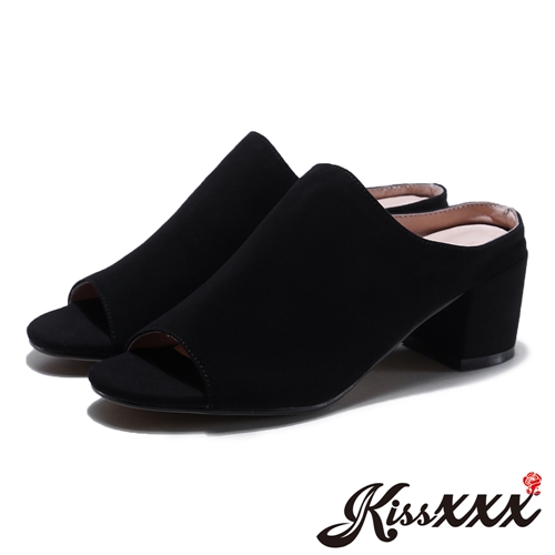 [快速出貨] 時尚百搭素面純色翻絨羊皮粗跟拖鞋 黑*KISSXXX* |