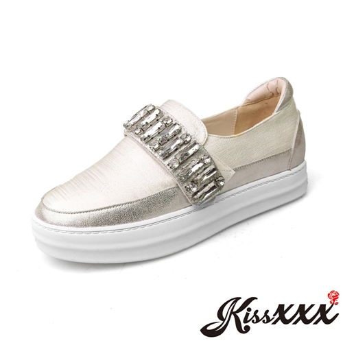 [快速出貨] 真牛皮閃耀大寶石內增高厚底樂福鞋 白*KISSXXX* |