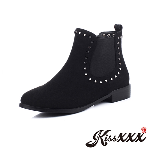 [快速出貨] 手工龐克鉚釘飾切爾西低跟短靴 黑*KISSXXX* |