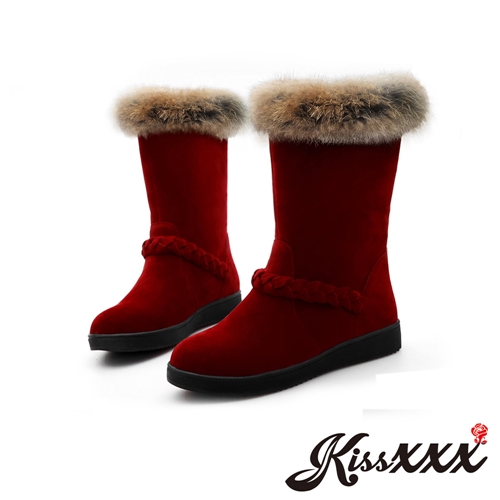 [快速出貨] 雪絨兔毛靴口金屬亮皮編織中筒雪靴 酒紅*KISSXXX* |