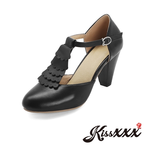 [快速出貨] 甜美宮廷風蕾絲花片T字釦粗跟涼鞋 黑*KISSXXX* |