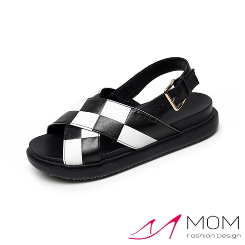 真皮經典交叉撞色格子圖樣厚底涼鞋 黑白*MOM* |