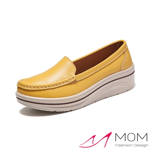 真皮純色氣質百搭坡跟厚底樂福鞋 黃*MOM* |