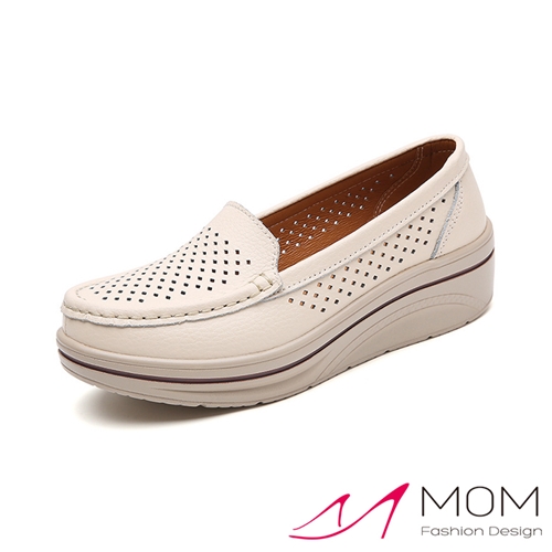 真皮純色氣質縷空沖孔百搭坡跟厚底樂福鞋 米*MOM* |