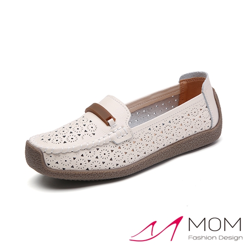 氣質純色縷空刻花釦帶時尚舒適平底蝸牛鞋 休閒鞋 米*MOM* |