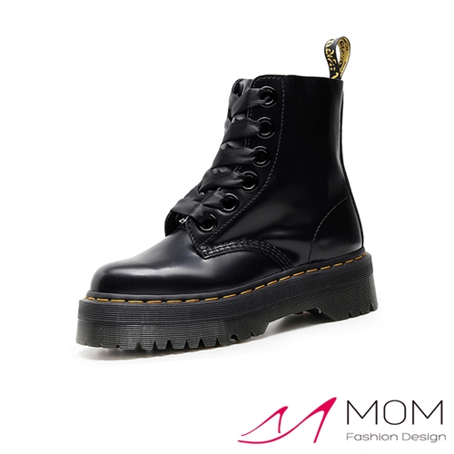 真皮時尚緞帶6孔繫帶厚底馬丁靴 黑*MOM* |