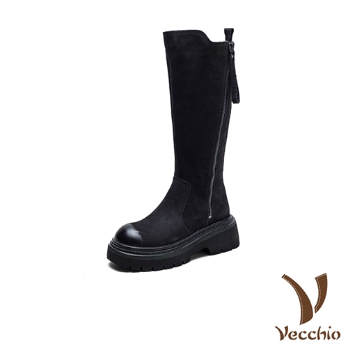 真皮頭層牛皮百搭復古粗跟厚底騎士靴 長靴 黑*VECCHIO* |