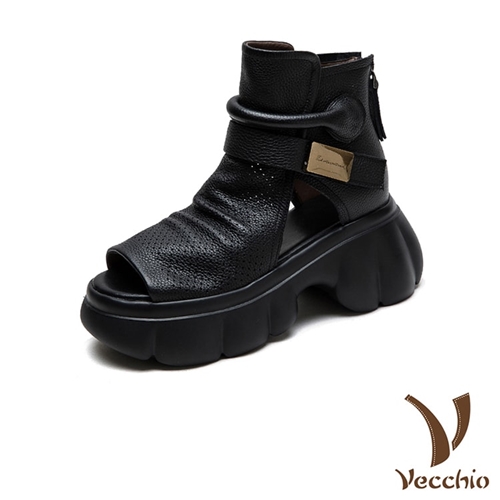 真皮頭層牛皮透氣沖孔挖空厚底一字釦帶羅馬涼鞋 黑*VECCHIO* |