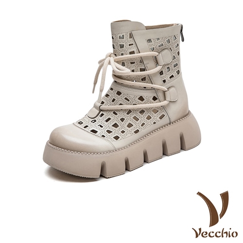 全真皮頭層牛皮復古縷空鬆糕厚底繫帶短靴 涼靴 米*VECCHIO* |