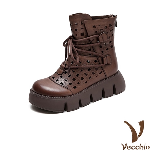 全真皮頭層牛皮復古縷空鬆糕厚底繫帶短靴 涼靴 棕*VECCHIO* |
