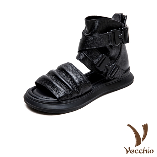真皮頭層牛皮復古時尚釦帶厚底羅馬涼鞋 涼靴 黑*VECCHIO* |