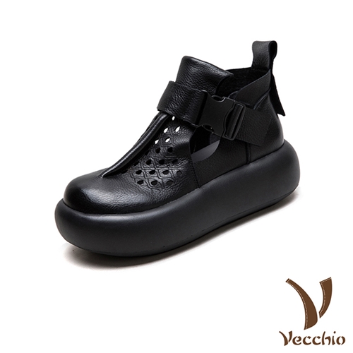 全真皮頭層牛皮縷空刻花釦飾鬆糕厚底短靴 涼靴 黑*VECCHIO* |