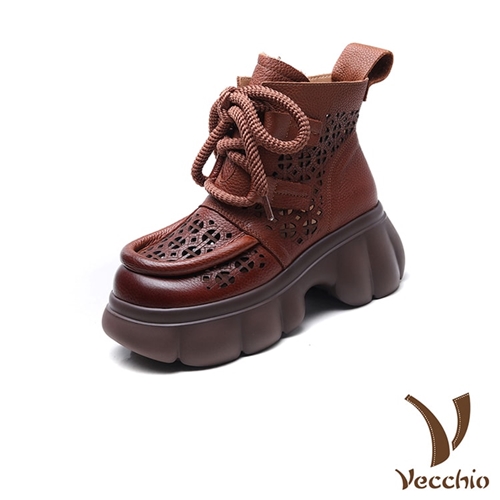 全真皮頭層牛皮復古縷空刻花繫帶厚底短靴 涼靴 棕*VECCHIO* |