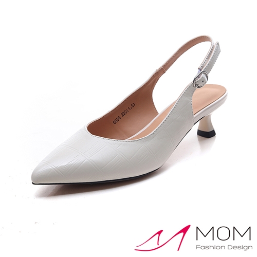 全真皮羊皮典雅壓紋小尖頭高跟包頭涼鞋 米*MOM* |