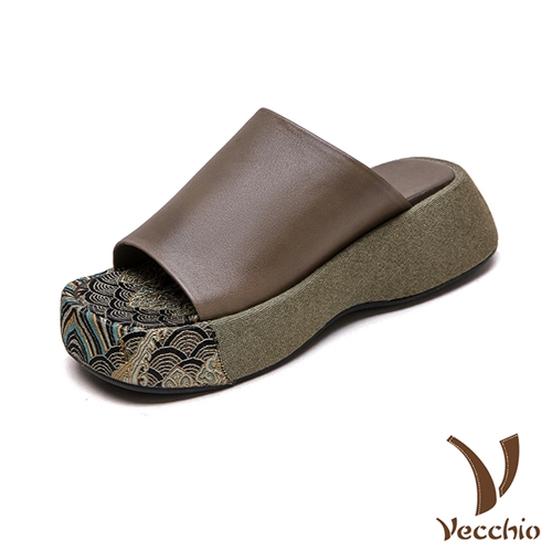 真皮頭層牛皮典雅刺繡拼接舒適厚底拖鞋 卡其*VECCHIO* |