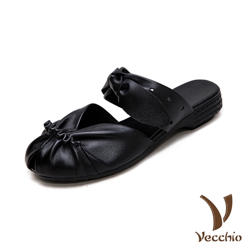 真皮頭層牛皮皺褶花邊蝴蝶結一字帶低跟包頭拖鞋 黑*VECCHIO* |