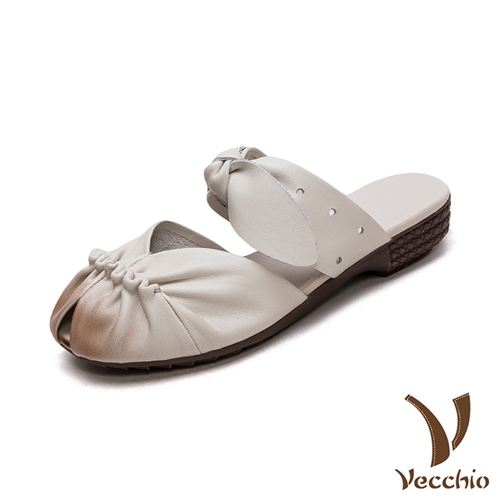 真皮頭層牛皮皺褶花邊蝴蝶結一字帶低跟包頭拖鞋 米*VECCHIO* |